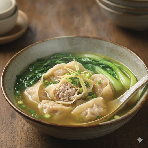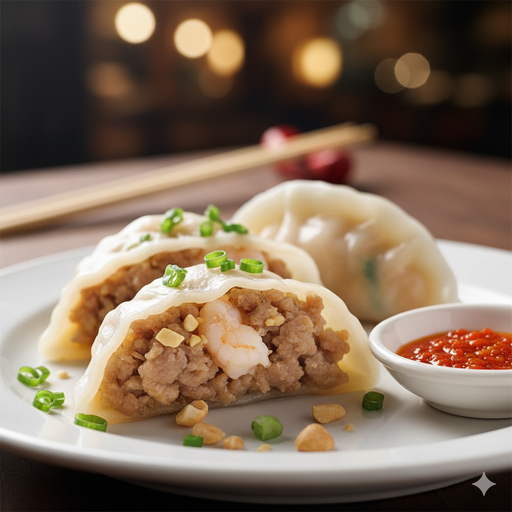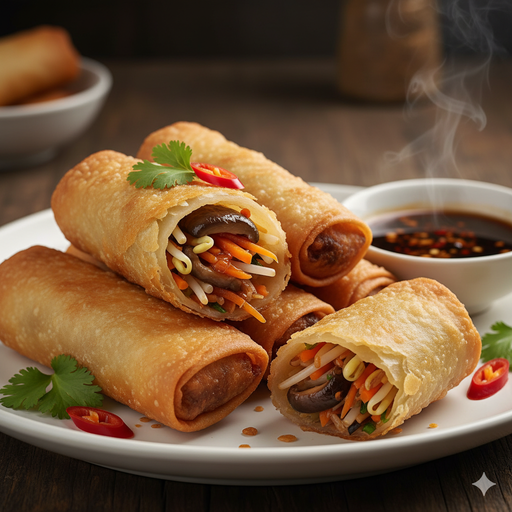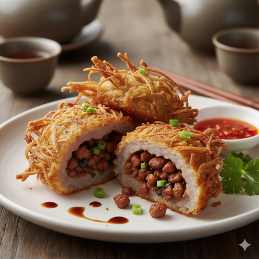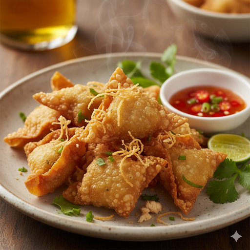 Kulit pangsit tipis berisi ayam dan udang cincang, digoreng hingga keemasan dan renyah.