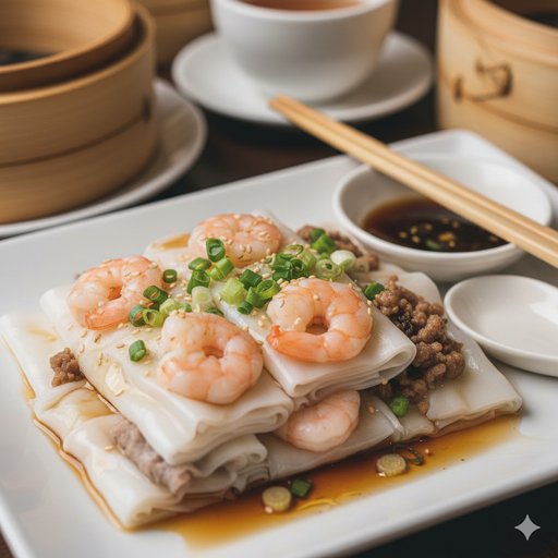 Gulungan tepung beras lembut berisi udang atau daging, disiram saus kedelai manis dan minyak wijen.