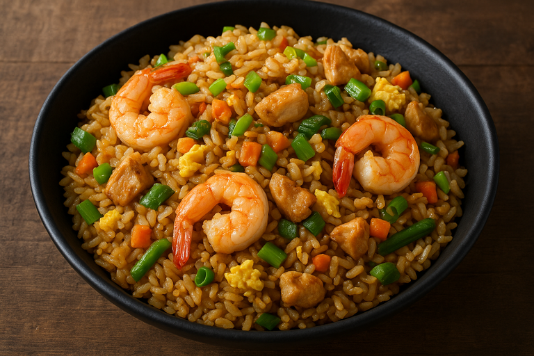 Nasi goreng dengan udang, daging ayam, telur, dan sayuran, dimasak dengan teknik wok hei.
