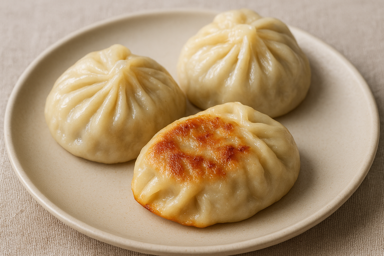 Dimpling kukus lembut berisi ayam cincang dengan campuran jamur dan bawang, disajikan hangat.